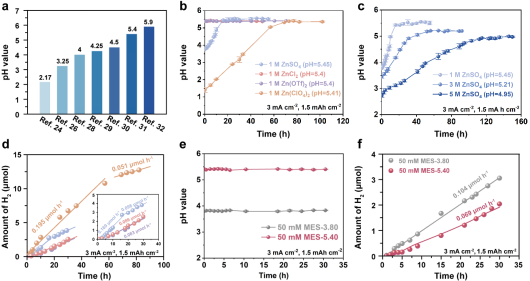 图1. 不同电解液的pH自稳定现象与析氢量分析。