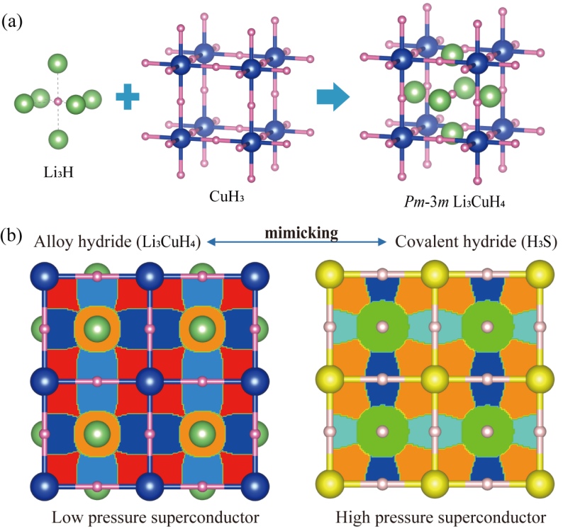 图 (a) Li3CuH4的结构设计示意图,(b) Li3CuH4与H3S中Bader电荷边界的相似性。