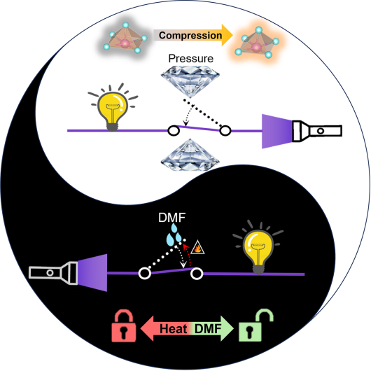 随着传感与信息安全技术的快速发展,传统光学防伪与检测材料已难以满足日益增长的多样化应用需求。传统光学响应材料常受限于单一刺激响应模式及不可逆的信号损失,制约了其在智能传感、信息加密与可循环动态显示等领域的实际应用。如何在同一材料中实现多种外界刺激(如压力、溶剂)的高效、可逆发光切换,并进一步拓展其在多功能光电系统中的集成应用,仍然是当前该领域面临的关键挑战。零维杂化金属卤化物作为一种新兴的多功能光电材料体系,通过其独特的“主-客体”结构框架和低维动态软晶格特性,展现出优异的发光可调性和对外界刺激的响应能力,被认为是构建多模态光学开关的候选材料。