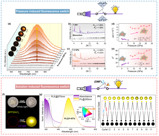 高压与超硬材料全国重点实验室肖冠军教授等人在多功能刺激响应荧光材料研究中取得重要进展,首次实现了在压力-溶剂双刺激下的多模态可逆荧光开关ON/OFF切换。借助压力处理与N,N-二甲基甲酰胺(DMF)溶剂工程,诱导晶格畸变和激子局域化,提高自陷激子辐射复合几率,实现了零维金属卤化物[BPP]SbCl5 (C13N2H16SbCl5)从无光到有光的可逆发光切换和优异的循环稳定性。研究团队进一步构建了高灵敏度DMF检测、多级光学防伪与可重构光学逻辑门等多功能集成系统,展示了其在智能传感与信息安全领域的重要应用潜力。相关研究成果以“Multimodal Fluorescent Switch: Pressure-Induced Emission and Solution-Induced Optical Anti-Counterfeiting and Logic Gates”为题发表在《Science Bulletin》上。
