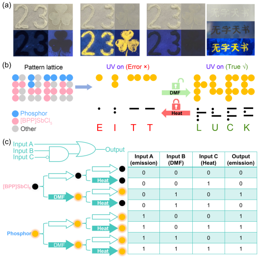 本研究报道了一种零维金属卤化物材料 C13N2H16SbCl5 ([BPP]SbCl5),首次在同一材料中实现了压力与溶剂双重刺激下的高效可逆发光开关行为。在高压条件下,材料在约7.4 GPa时发生从单斜相到三斜相的结构转变,晶格畸变与对称性破缺显著增强电子–声子耦合,从而激活自陷激子(STE)宽带橙光发射,实现从 “暗态” 到 “亮态” 转变的压强诱导发光PIE。随着压力进一步增加至23.0 GPa,发射强度持续稳定增长,同时在经历多次“压缩–卸压”循环后可实现发光“ON/OFF” 可逆恢复。此外,材料对DMF表现出高度选择性溶剂响应,DMF可快速“点亮”高效黄色发光态,光致发光量子产率高达97%。这种“开启”态可通过温和加热完全逆转,恢复至非发光态。溶剂诱导的开关行为展现出卓越的循环性能,可逆循环超过10次且性能无衰减。基于上述特性,研究团队进一步展示了该材料在DMF高灵敏度检测(快速响应且选择性优异)、可逆多级光学防伪(溶剂显影/加热擦除双模式加密)及可重构光学逻辑门(执行A + B・C’逻辑运算)中的集成应用,系统验证了其在智能传感、动态信息加密和可编程光计算等方面的应用潜力。