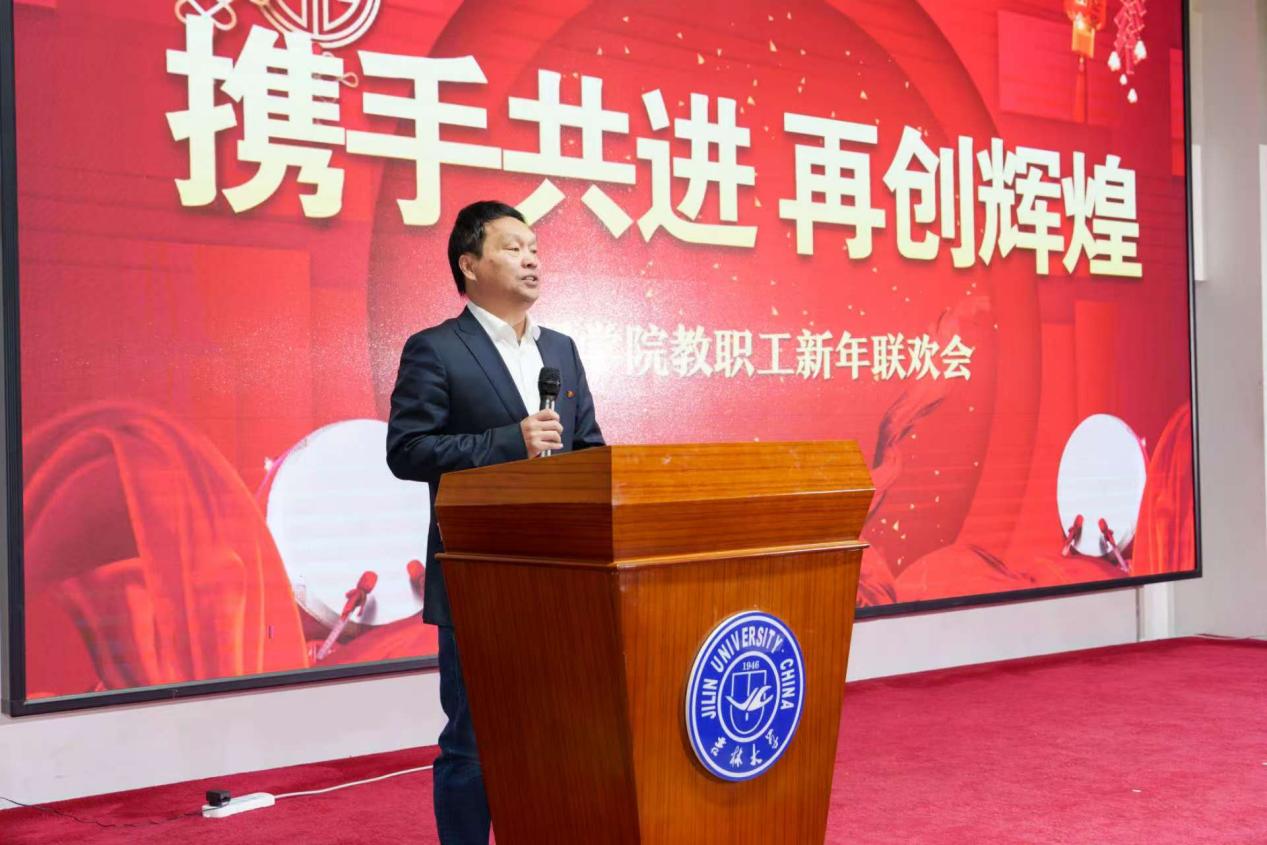 全体领导班子成员与150余名教职工欢聚一堂,共迎新春。安徽大地熊新材料股份有限公司常务副总经理、1993级校友陈静武,金黄集团总经理李明,长春启明光电科技有限公司总经理杨胜利,吉林大学科研院科技管理办公室副主任、2000级校友郭庆等嘉宾现场出席。92级校友陈汉栋、93级校友于猛通过云端连线参与,与在场师生温情相聚,共话情谊,同庆新年。