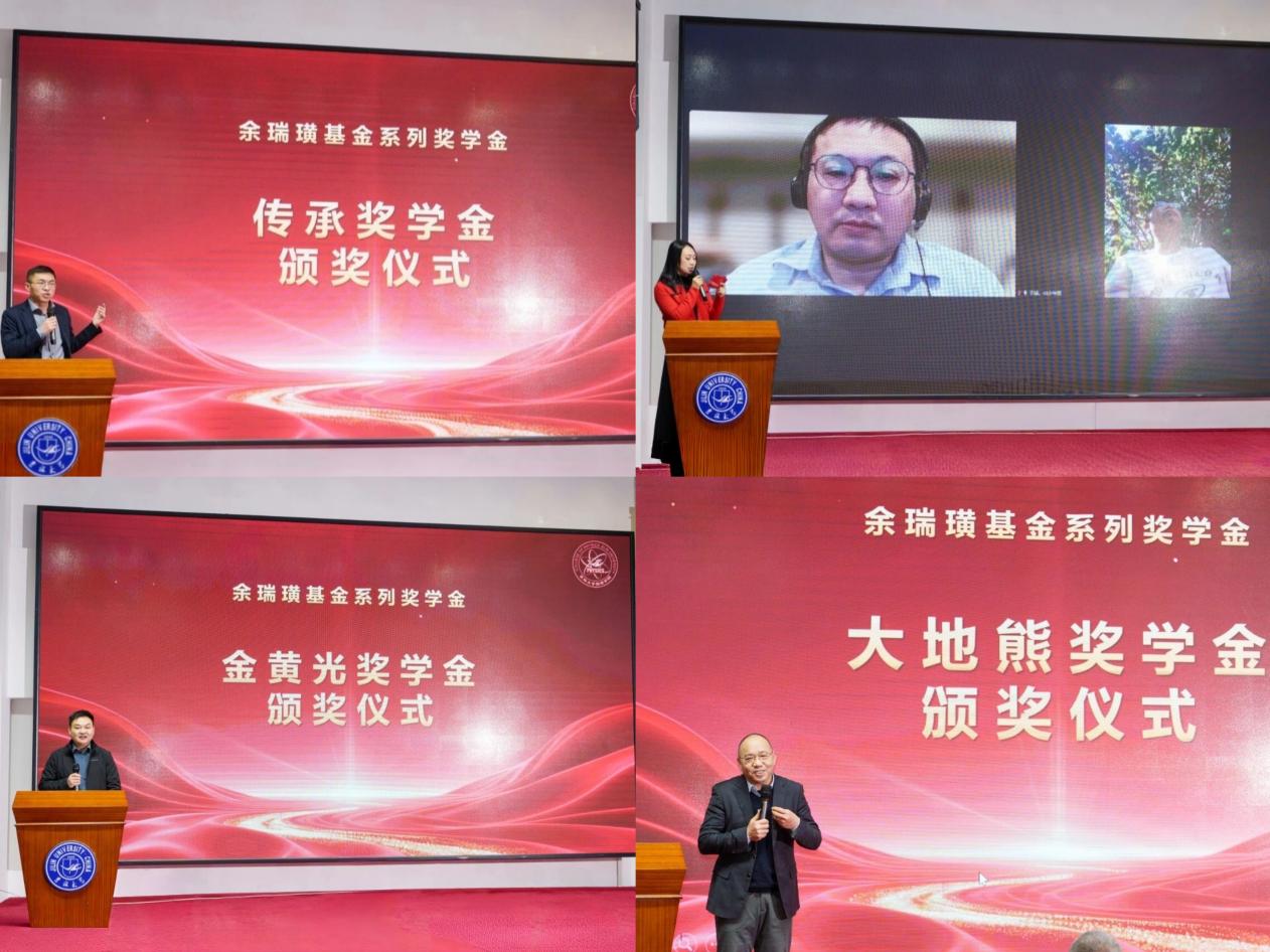奠基人余瑞璜先生命名,涵盖传承奖学金、少年班校友奖学金、金黄光奖学金和大地熊奖学金,旨在通过多元激励融入学生成长全过程。2000级校友郭庆、金黄集团总经理李明、93级校友陈静武分别作为相应奖学金的捐赠方代表为获奖学生颁奖并送上祝福。92级校友陈汉栋、93级校友于猛通过线上方式寄语学子,勉励他们接续奋斗。