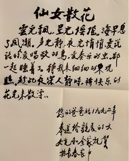 1992年我回国探亲时谈起这首歌,我请父亲把歌词写下来留作纪念。我现在还一直保存着父亲用毛笔写的这首歌词,父亲还教我唱英文歌,《月光照在科罗拉多河上》(“Moonlight on the river Colorado”)。